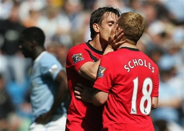 Это фото ESPN Soccernet разместил после субботнего манчестерского дерби, при этом назвав файл nevillegay. Затем название было изменено на nevillekiss, а потом фото и вовсе удалили со страниц авторитетного сайта.