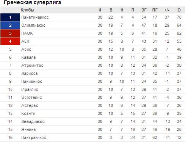 Аккурат на этих выходных завершился чемпионат Греции, который распределил места команд в еврокубках. Ничего экстраординарного не произошло – на вершине все те же. «Панатинаикос» - групповой этап ЛЧ, «Олимпиакос» - третий отборочный раунд, ПАОК и АЕК – в ЛЕ. Еще одно место достанется либо «Кавале», которая играет в финале Кубка Греции с «Панатинаикосом», либо «Арису», который завершил сезон на пятом месте.