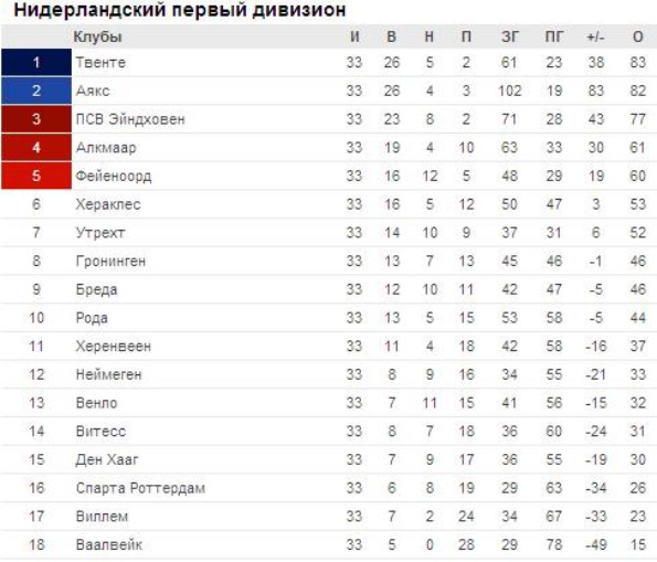 Следом идут ПСВ, «Фейеноорд», АЗ Алкмаар и «Эраклес». В финале национального Кубка сыграют «Аякс» и «Фейеноорд», поэтому место в ЛЕ достанется шестой команде – «Эраклесу» или «Утрехту».