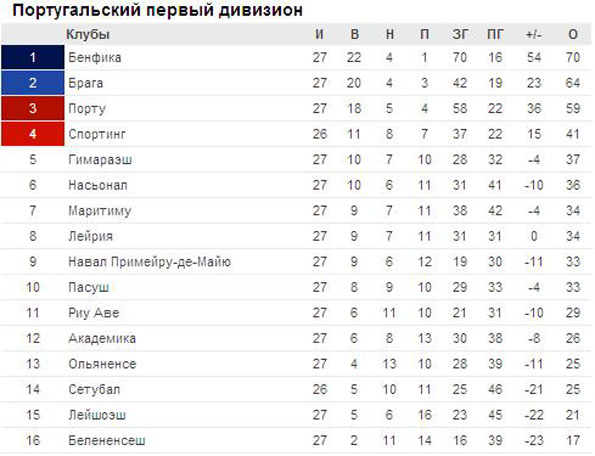 «Бенфика» без пяти минут чемпион и участник группового этапа Лиги чемпионов. На второй строчке с отрывом в 5 очков от третьего места расположилась «Брага», что не может не радовать, ведь именно она будет возможным соперником вице-чемпиона Украины в квалификации ЛЧ, а это вариант получше, чем «Порту», хотя все равно нужно смотреть на рейтинг команд и «посев».