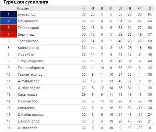 А тут нас по итогам чемпионата может ждать маленькая, но приятная неожиданность! На вершине «турнирки» расположился малоизвестный «Бурсаспор», который, правда, всего на одно очко опережает «Фенербахче». Напомню, что чемпион Турции напрямую попадает в групповой раунд Лиги чемпионов.