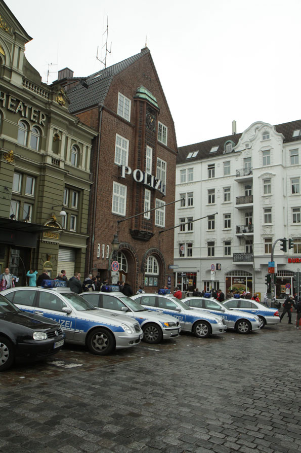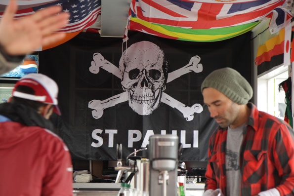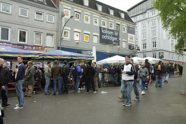 Точка разлива находилась неподалеку. Символика, изображенная на флаге, указывала, что разливали пиво парни неравнодушные к клубу «Санкт Паули». Ничего удивительного! Фан-зона была расположена в самом сердце одноименного припортового района, где находится и знаменитая гамбургская улица «красных фонарей». Несмотря на достаточно скромные достижения «Санкт Паули», болельщики гордятся своим клубом. У них довольно сложные отношения с фанатами HSV Hamburg, как, например, в Манчестере между поклонниками MU и ManCity. За «Санкт Паули» тоже болеют «суровые» парни окраин:) «На раене» мы встретили нескольких таких правильных парней, которые с презрением наблюдали за вычурными гостями из Испании.
