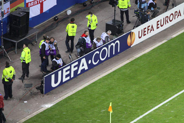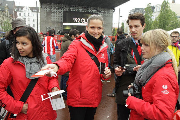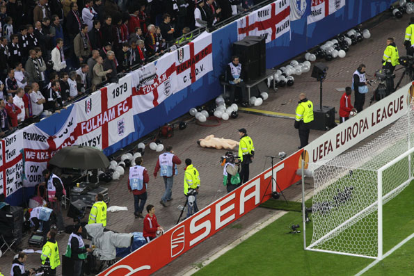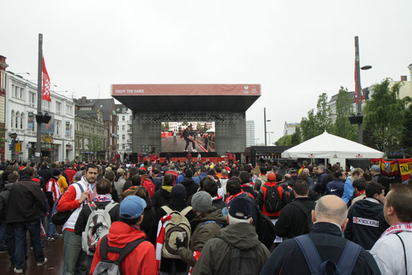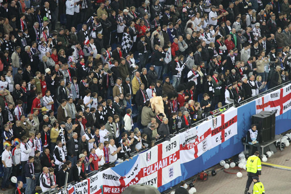 Болельщики «Фулхэма» проигнорировали фан-зону, разбив свой табор за углом, прямо напротив улицы «красных фонарей» и рядом с многочисленными английскими пабами. За некоторыми группами фанов «Фулхэма» тенью ходили люди в гражданском с харакерными проводками в ушах и задачей предвосхитить возможные потасовки. К слову, несмотря на популярность алкогольных напитков среди болельщиков обеих команд, никаких стычек не наблюдалось. Правда, на следующее утро в районе Риппербана был замечен британский болельщик с расквашенным носом.