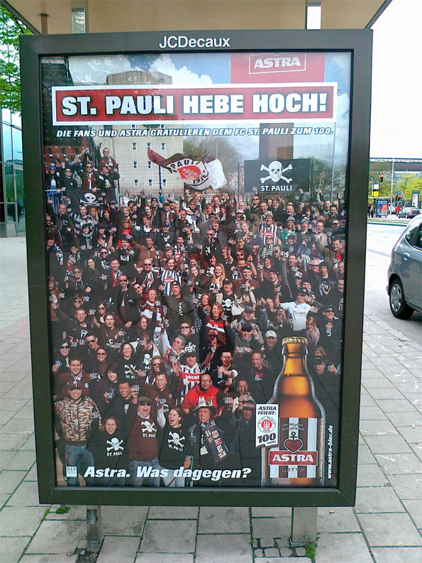 Ну и какой же футбол без пива. В районе фан-зоны большой популярностью пользовалось пиво ASTRA, хмельной напиток местного разлива. Варят его рядом, на пивзаводе HOLSTEN, только ASTRA является сугубо местным брендом, в отличие от знаменитого далеко за пределами Гамбурга HOLSTENа. ASTRA позиционируется как пиво болельщиков «St.Pauli». О чем и гласит реклама, залепившая весь Гамбург.