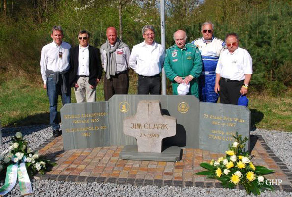 Вместе с ветеранами автоспорта Курс Аренс (первый спарва) и его коллеги возложили цветы к памятнику шотландского гонщика, установленного в 2008 году неподалеку от места гибели Джима
