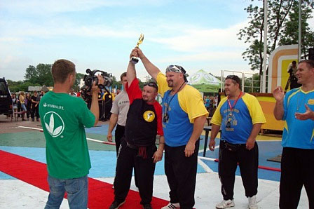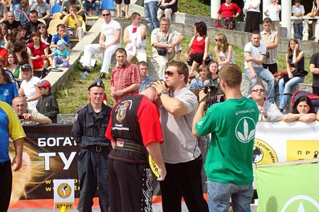 Заключна вправа пройшла за всіма законами гостросюжетного жанру, ставши справжнім апогеєм «Народного богатиря»: хлопці просто «рубалися» не на життя, а на смерть :) Емоції переливалися через край, кожен хотів довести своє право на майбутні виступи у професійних турнірах. Доволі важка естафета, під час якої слід було один за одним підняти і зафіксувати над головою чотири снаряди зі зростаючою вагою, вкотре показала, що на перемогу у спорті богатирів може розраховувати лише той атлет, котрий витримає всі випробування. Таких у фінальній вісімці виявилося лише двоє. Найважчим, після підняття 60-кілограмової гантелі, 90-кілограмової колоди і 120-кілограмового «акселя», було знайти в собі сили і підняти ще й колоду вагою у 130 кілограмів. Віталій Міхеєв, котрий нині мешкає у Вишневому під Києвом, зумів це зробити приблизно за одну хвилину. Публіка, яка гаряче підтримувала Міхеєва з самого початку, без перебільшення «стояла на вухах». Але справжня кульмінація чекала на вболівальників далі: Дмитро Тишецький «підкидав» снаряди догори наче «гумові» - настільки енергійно це виходило у черкаського атлета: всі чотири снаряди були підняті за 42,02 секунди! Нарешті, прийшла черга двом до цього моменту найкращим атлетам виконувати естафету. Однак ані Стахурський, ані Костенюк не змогли підняти 130 кілограмів. Фатальним для першого місця Павла стало те, що він надто повільно виконував естафету: швидше за недавнього лідера підняли «аксель» на передостанньому етапі і Стахурський, і земляк Ворник, і макіївчанин Курбатський. В підсумку, Костенюк програв Тишецькому на самому фініші аж 5 балів, дозволивши черкащанину наздогнати себе у загальному заліку. При рівності балів вступило у силу правило кількості перемог в окремих дисциплінах. 2 звитяги Тишецького переважили одну Костенюка. Таким чином, вихованець Віктора Юрченка, наче на трампліні, заскочив на першу сходинку з третього місця і став першим переможцем телепроекту «Народний богатир», який можна буде переглянути на телеканалі «Тоніс» у новому сезоні, починаючи з 28-го серпня.