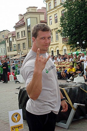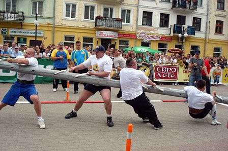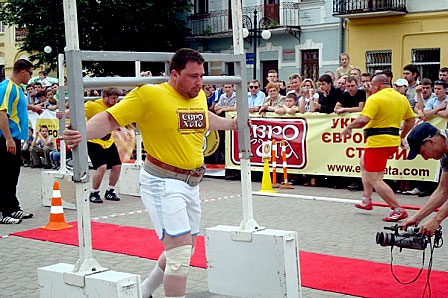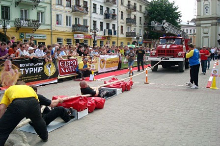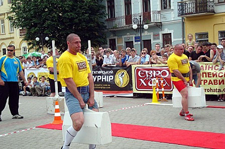 Третя вправа – ще одна підстава для захопленого вболівання. До речі, майдан Андрея Шептицького, котрий вже традиційно став ареною богатирських змагань в Станіславі, був заповнений людьми, котрі намагалися палко підтримувати і своїх, і чужих. Щоправда, інколи глядачі настільки були вражені виконанням, що, відкривши рота, забували плескати і криком підтримувати хлопців: ведучому доводилося їм постійно про це нагадувати J. Треба вчитися в європейських фанатів! В естафеті, що складалася з двох етапів (першому атлету слід було 20 метрів пронести «гирю-качечку» вагою 180 кг, а другому – коромисло на таку ж дистанцію), краще за інших виступили Черкаси, котрі перемоли Чернівці в очній дуелі. Це дозволило вихованцям Віктора Юрченка наздогнати Львів і скоротити відставання від Чернівців до 2 очок. З іншого боку для Костенюка і Ворника ця локальна поразка не стала серйозною втратою, адже їхня перевага над переслідувачами лише зросла, завдяки невдачі галицької команди.