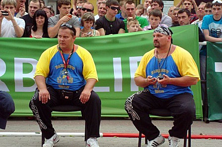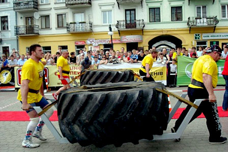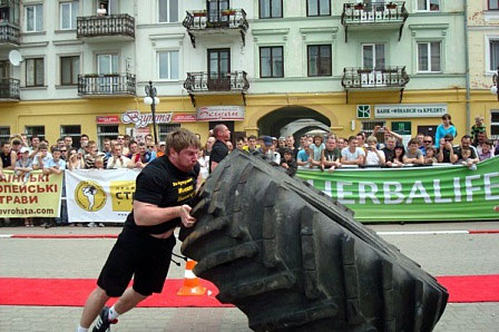 У другій вправі на нас чекало справжнє видовище. Обертання колеса тягнула за канат двома атлетами завжди захоплює. Спочатку команда Донецька (Курбатський і Зоненко) у надзвичайно запеклій боротьбі випередила киян Бордюжу і Лагутіна (хлопці народилися відповідно у Кіровограді і Броварах, однак обоє тренуються у столиці). Далі більше – Черкаси видали вражаючий результат, перегнавши Київську область майже на вісім секунд: Тишецький вже давно відпочивав, поки Міхеєв закінчував перекидати колесо.