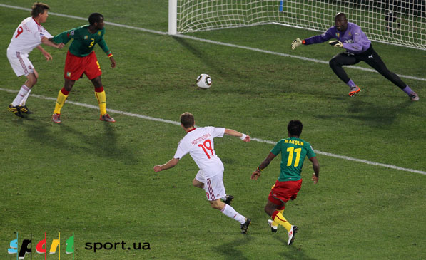 Затем Дания поймала Камерун на контратаке. Бендтнер перевел мяч на фланг Роммедаля, который прокинул мяч мимо Макуна и левой послал мяч в дальний нижний угол. Сыграл, как и положено крайнему форварду. Защита не справилась. Тот же Ассу-Экотто слишком увлекся атаками и только возвращался в свою штрафную, когда мяч залетал в ворота. Хотя, в общем-то, этот игрок вероятно был бы также точно обыгран Роммедалем, как и Макун.