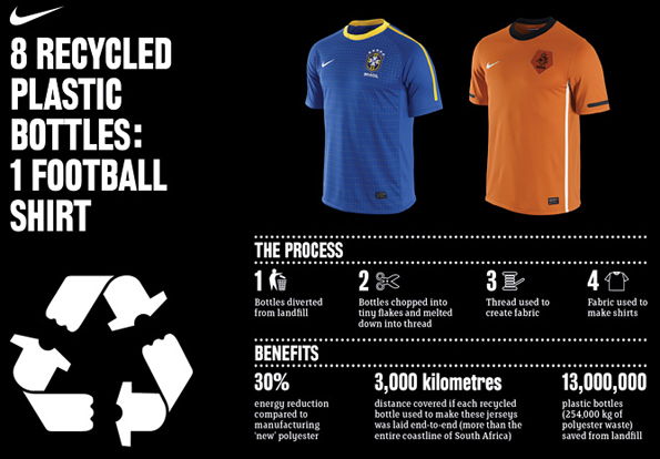 В матче 1/4 финала чемпионата мира-2010 между сборными Голландии и Бразилии футболисты выйдут на поле в футболках Nike из переработанных пластиковых бутылок. Для производства формы национальных команд было использовано 13 миллионов пластиковых бутылок для воды, а это около 254 000 кг отходов из полиэстера.
