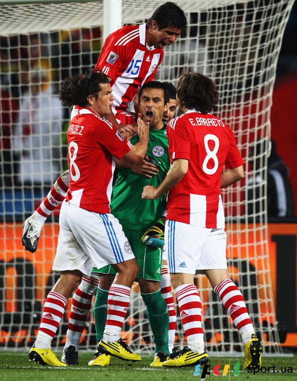 Не успели парагвайцы отгоревать свой упущенный шанс, как пенальти был назначен в их ворота. Вилья убегал от Алькараса, в штрафной стал тормозить-подставляться, в общем, аккуратно и грамотно заработал пенальти. И не захотел его бить, несмотря на всю бомбардирскую гонку. Есть задачи поважнее. Хаби Алонсо пенальти забил, но рано радовался и высоко прыгал. Судья заставил перебить из-за преждевременного входа в штрафную испанских футболистов. И вот тут, уже на максимуме драматизма, Вильяр взял второй удар Алонсо, и сумел также помешать добить Фабрегасу, а удар Рамоса блокировал да Сильва. Отбился Парагвай, в серии пенальти счет так и не был открыт.