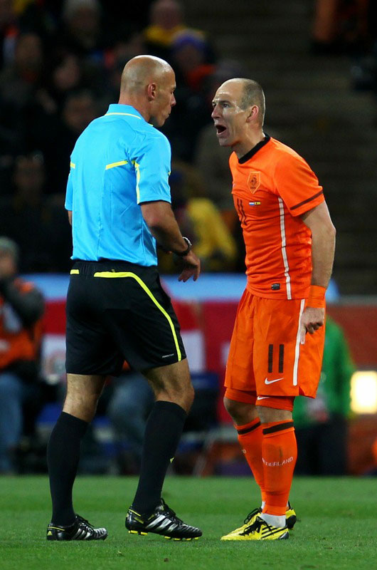 Хейтинга сумел вставить свою ногу в спицы еще одной испанской атаке, когда Иньеста был уже в штрафной, то есть, было очень опасно. Ну а Роббен снова убегал, даже улетал один на один, но перед штрафной был остановлен Пуйолем. Карлес обхватил Арьена рукой, затем выполнил какой-то элемент из народных танцев (подсечку), но сбить голландца с ног не сумел. Роббен же в свою очередь и не упал, и не забил, потом уже долго доказывал Уэббу свою правоту, за что получил желтую карточку. При этом желтая карточка стала бы для Пуйоля второй.