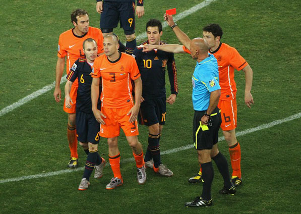 У голландцев и таких моментов не было. Впрочем, испанские шансы вскоре закончились, пошла игра без ворот. Команды демонстрировали все то оборонительное могущество, которым обладают, все те навыки разрушения, которые и помогли им выйти в финал (наряду с временами демонстрируемым мастерством созидателей). Минут двадцать команды отлично разрушали атаки друг друга, а порой даже и друг друга. Тому свидетельством 5 желтых карточек. Наконец-то получил свое Ван Боммель, впечатляюще врезался шипами в грудь Хаби Алонсо Де Йонг. По делу получили карточки и испанские грубияны Пуйоль и Рамос.