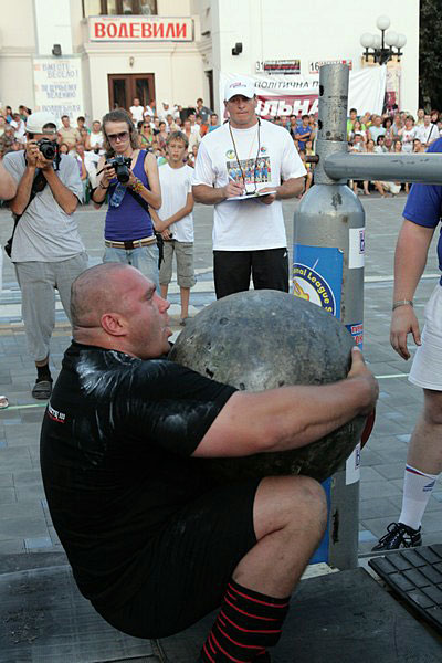 Вправа №6. «Манхуд Стоунз» (Перекидання кулі 180 кг, висота 130 см, ліміт часу 3 хвилини).