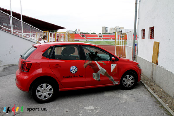 Новый Поло. Не реклама. Автомобиль на службе у стадиона. Именно на нем возили докачивать мячи.