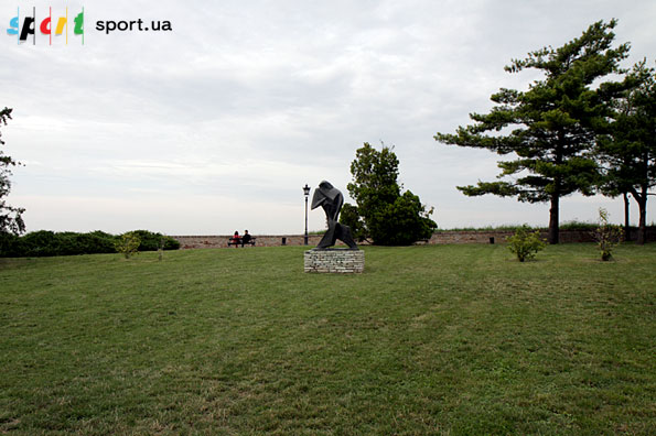Вид на Новый Сад. Справа от моста - великолепно обустроенная пляжная зона. Вход платный - 5 грн. Зеленые газончики меняются с приятным песочком, множество детских зон, бары, лежаки, все очень по-европейски. А вот главная - плавательная часть - очень хромает. Зона купания ограничена буквально 10-15-ю метрами от берега, вода совершенно непрозрачная (это Вам не киевский Гидропарк!). Но самое главное неудобство - невероятно сильное течение! Сносит, даже, когда просто стоишь в воде! Потому и буйки так близко, очень легко утонуть. В день игры с самого утра на город упала наша привычная жара, поэтому до обеда мы с коллегами провалялись на пляже.