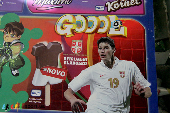 А вот интересный маркетинговый ход - у сборной Сербии есть собственное официальное мороженое. Рекламирует его любимчик местной публики - Никола Жигич.