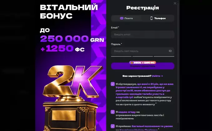 Реєстрація в казино 2К