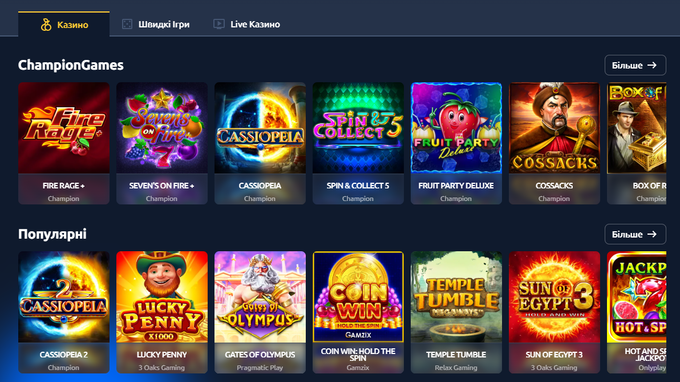 Champion Club — нове онлайн-казино для гравців з України, що відкрилося у 2024 році. Воно пропонує відвідувачам широкий вибір азартних розваг: слоти, лобі з живими дилерами, crash-ігри. Усі нові клієнти оператора можуть отримати бонус за реєстрацію, що складається із 3 частин.