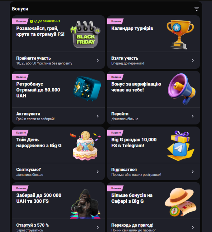 Також на сайті проходять акції з бонусами за депозити та активність. Постійні пропозиції: