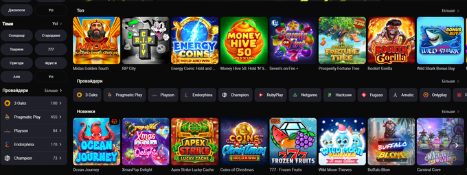 - Слоти. Pragmatic Play, Red Tiger, Play'n Go, Spinomenal, Fazi, Yggdrasil, Wazdan, High5, Inbet, KA Gaming.