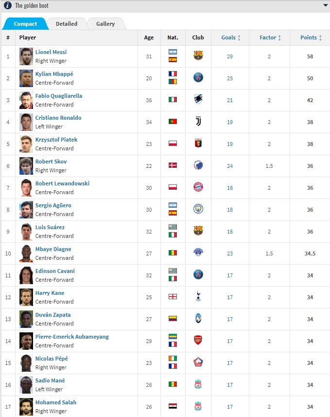 58 очок: Ліонель Мессі (Барселона, Іспанія) – 29 голів x 2 (множник ліги)