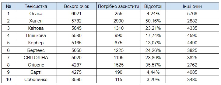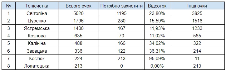 Розглянемо першу десятку рейтингу WTA і вісім кращих українок. Болдом виділена сума очок, які потрібно захистити.