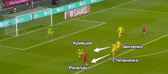 Заради справедливості потрібно відзначити, що одна з його помилок вчора привела до другого гольового моменту Роналду, кінцівку якого ми вже розглянули. Починався цей епізод з того, що на 27-й хвилині Матвієнко в черговий раз намагався відрізати купку суперників, але не помітив Невеша, який стартував в останній момент і перехопив передачу на Степаненка.