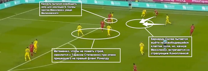 Найпоширенішим сценарієм руху м'яча стали діагоналі Невеша на Канселу, який завжди знаходився на брівці далеко від Миколенко та Малиновського, які тримали стрій.