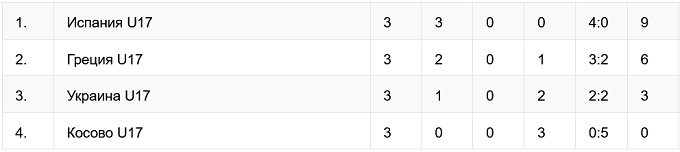 Україна (U-17): Нещерет - Ебуджуо (Рубчинський, 78), Забарний, Батагов, Вівчаренко - Кобилянський, Судаков, Скорко - В'юнник, Гончарук (Ванат, 61), Близниченко