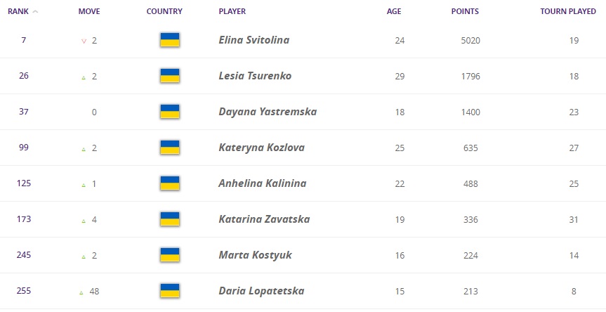 Що стосується інших українок, то трохи піднялися Леся Цуренко і Катерина Козлова, друга повернулася в першу сотню. Дар'ї Лопатецькій зарахували очки за перемогу на 25-тисячнику в Японії і тепер вона близька до того, щоб обійти в рейтингу Марту Костюк.