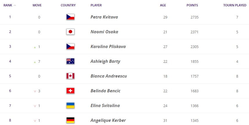 У Чемпіонській гонці величезний ривок зробила Ешлі Барті, тепер вона четверта. Плішкова піднялася в топ-3. Світоліна втратила одне місце, але поки в топ-8.