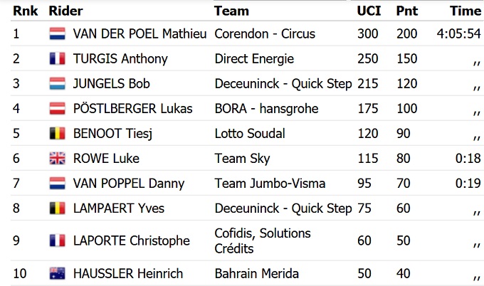 24-річний голландський гонщик Матьє Ван Дер Пул став переможцем одноденки Світового туру Дварс доор Фландерен. У фінішному спринті він випередив Антоні Туржі і Боба Юнгельса.