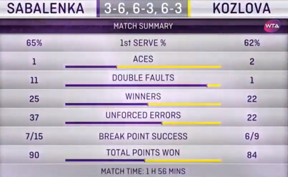 Катерина Козлова (Україна) - Аріна Соболенко (Білорусь) - 6:3, 3:6, 3:6