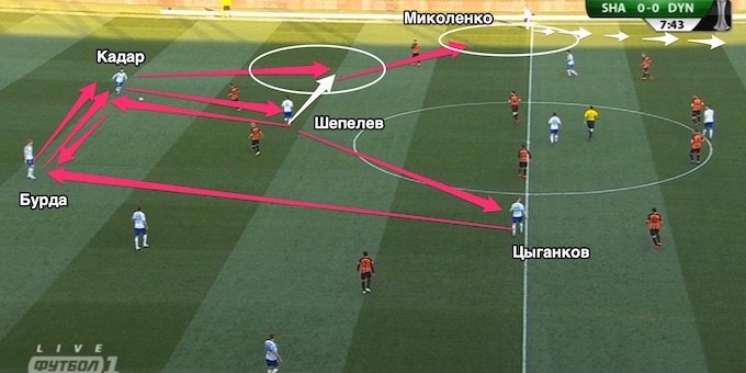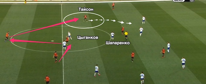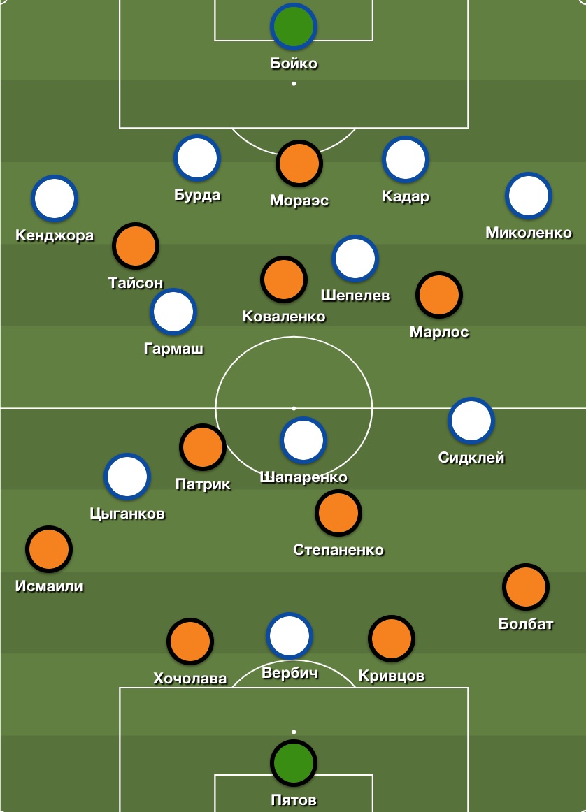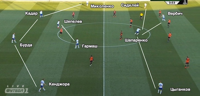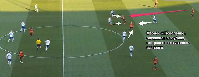 Господарі далеко не у всіх епізодах могли ефективно знаходити вільні зони за спинами півзахисників «Динамо». Сідклей та Циганков діяли максимально вузько і близько до Шепелева із Гармашем, не даючи Марлосу, Коваленку та Тайсону отримувати м'яч у вільному просторі. Також потрібно відзначити, що Шапаренко добре рухався за спиною Вербича, намагаючись перекривати шляхи передач в центрі.