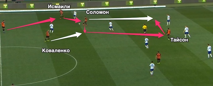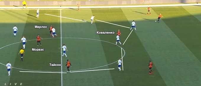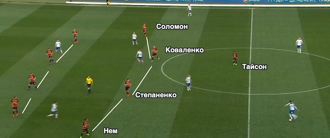 Після видалення Мораеса вже і «Шахтарю» довелося перебудовуватися в 4-4-1. Ще після перерви Коваленко вирушив на позицію центрального півзахисника, коли Нем змінив Патріка. Тайсон зайняв місце Мораеса на вістрі атаки, а з боків тепер грали свіжі Соломон і Нем.