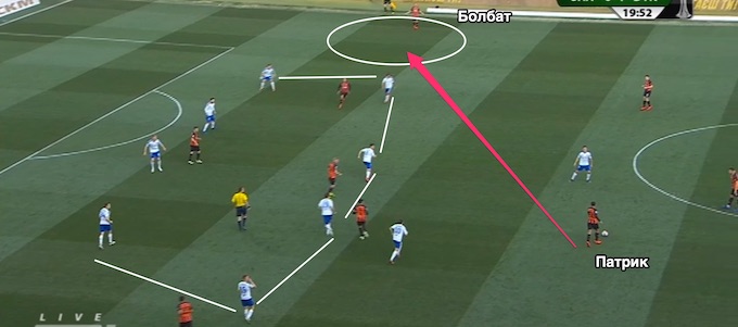 Одна з таких діагоналей в результаті закінчилася першим небезпечним моментом «Шахтаря». На 21-й хвилині Патрік добре розгорнув атаку на протилежний фланг, де Болбат отримав досить простору і часу, щоб і обігратися з партнером і зробити подачу до штрафного майданчика. Після навісу в штрафний «Динамо» утворився невеликий хаос, в якому найкмітливішим виявився Тайсон, який пробив в поперечину.