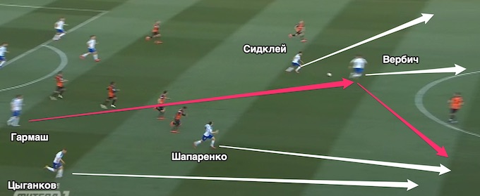 Після досить довгого перепасування Шепелєв таки знайшов вільну ділянку поля між першою лінією зустрічаючих футболістів у складі Коваленка/Мораеса і Марлоса. Шепелев класно в темп віддав на Миколенко і той, вже перебуваючи за спиною відіграв Марлоса, досить легко пройшов Болбата, віддавши в штрафну прямо в ноги Вербичу. Сьомий номер розвернувся, знайшов Шапаренка. Удари Шапаренка та Вербича були заблоковані, але Гармаш подарував нам міні-шедевр після підбору м'яча на підступах до штрафного майданчика.