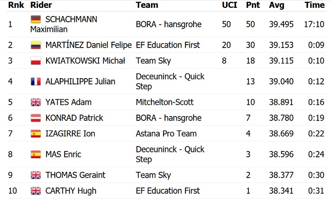 Німецький гонщик команди Bora Hansgrohe Максімільян Шахманн став переможцем першого етапу Туру Країни Басків, яким була 12-кілометрова індивідуальна розділка.