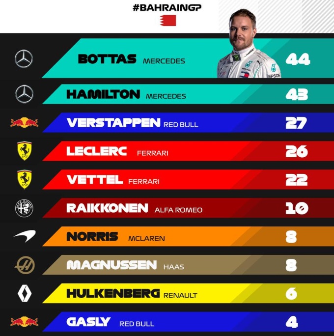 Поки Феррарі ніяк не може провести стабільну гонку, на вершині загального заліку два пілоти Мерседеса і Макс Ферстаппен з Ред Булла. Валттері Боттас на один пункт випереджає Хемілтона, а ось Ферстаппен відстає вже досить серйозно. Топ-5 замикають Леклер і Феттель, і якщо вони не хочуть відстати ще більше, потрібно терміново повертатися до перемог.