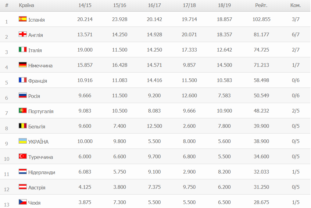 Таблиця коефіцієнтів УЄФА. Іспанія і Нідерланди набирають очки