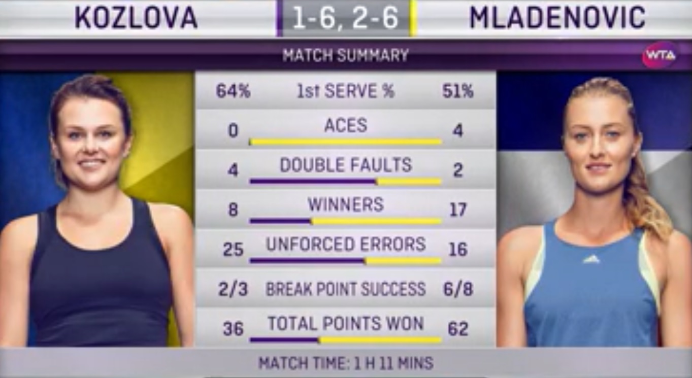 На старті другого сету Младенович повела 3:0 з двома брейками, сумнівів про переможницю матчу не залишалося. До честі Козлової, вона спіймала суперницю на розслабленості і зуміла взяти два гейми поспіль. Але відродити справжню інтригу не вийшло: наступна своя подача була легко віддана і Младенович виходить до чвертьфіналу. У поточному сезоні більше двох матчів на одному турнірі француженка не вигравала. Можливо, під керівництвом Саші Байїна у неї вийде реанімувати свою кар'єру. Як мінімум проти українок вона зіграла на досить високому рівні.