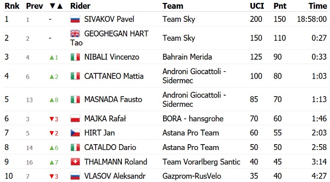 Заключний етап Туру Альп виграв Фаусто Маснада, який раніше переміг на третьому етапі. У загальному заліку перемогу святкував росіянин Павло Сиіваков з Sky. Він випередив переможця вчорашнього етапу Тао Ґеоґеґана Харта і Вінченцо Нібалі.