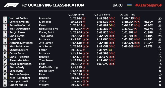 Топ-10 кваліфикації Гран-прі Баку: Боттас, Хемілтон, Феттель, Ферстаппен, Перес, Квят, Норріс, Джовінацці, Райкконен, Леклер