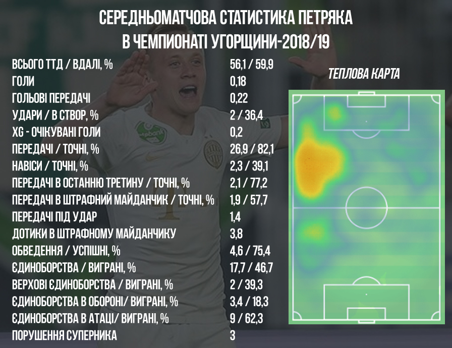 Не випадково, за індексом Wyscout Петряк на поточний момент входить до числа кращих одинадцяти гравців чемпіонату Угорщини, займаючи улюблену позицію лівого атакуючого півзахисника.