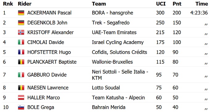 Гонщик Bora Hansgrohe Паскаль Аккерманн виграв одноденку Ешборн - Франкфурт. Чемпіон Німеччини випередив співвітчизника Джона Дегенкольба і переможця попередніх чотирьох видань гонки Александера Крістоффа.