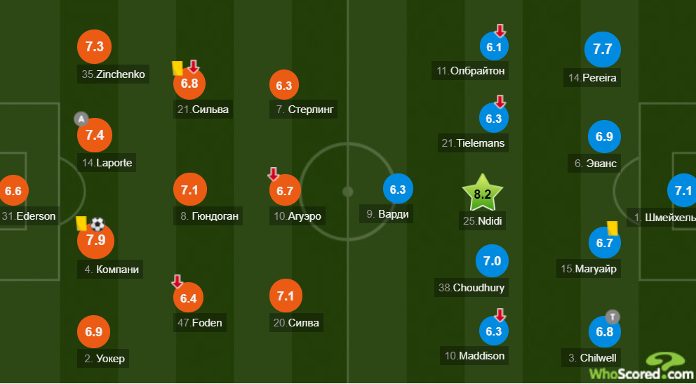 Авторитетний футбольний веб-портал WhoScored виставив оцінки гравцям матчу 37-го туру АПЛ, в якому «Манчестер Сіті» мінімально обіграв «Лестер Сіті» з рахунком 1:0.