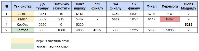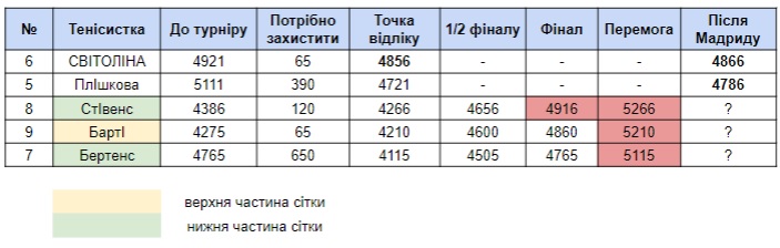 Виліт Кароліни Плішкової пішов на руку Еліні Світоліній. Після Мадрида українка тимчасово може повернутися в топ-5, якщо Слоан Стівенс не вийде в фінал, або якщо Ешлі Барті або Кікі Бертенс не виграють турнір. Найгірший варіант в короткостроковій перспективі: фінал Барті - Стівенс з перемогою австралійки (підсумок - сьоме місце).