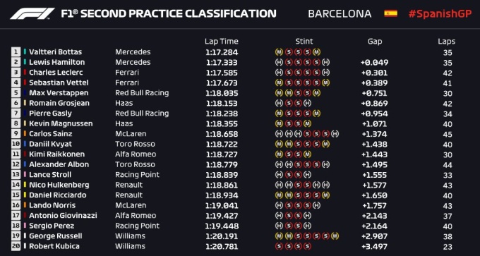 У другій практиці найшвидшим знову був Боттас, який випередив напарника Люіса Хемілтона на 0,049 секунди. Топ-4 замкнули пілоти Феррарі, але відставання вже 0,3 секунди.