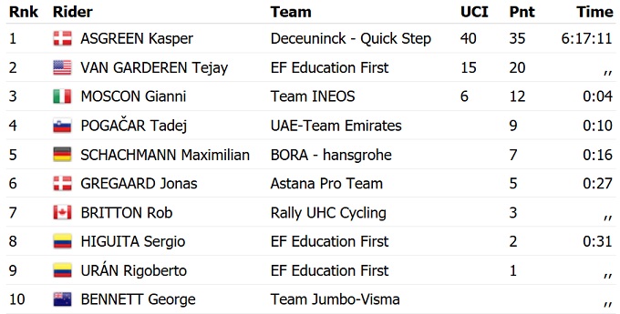 Переможцем другого етапу багатоденки Тур Каліфорнії став гонщик Deceuninck Quick Step Каспер Асгрен. На фініші він випередив Джанні Москона і нового лідера загального заліку Тіджея Ван Гардерена.